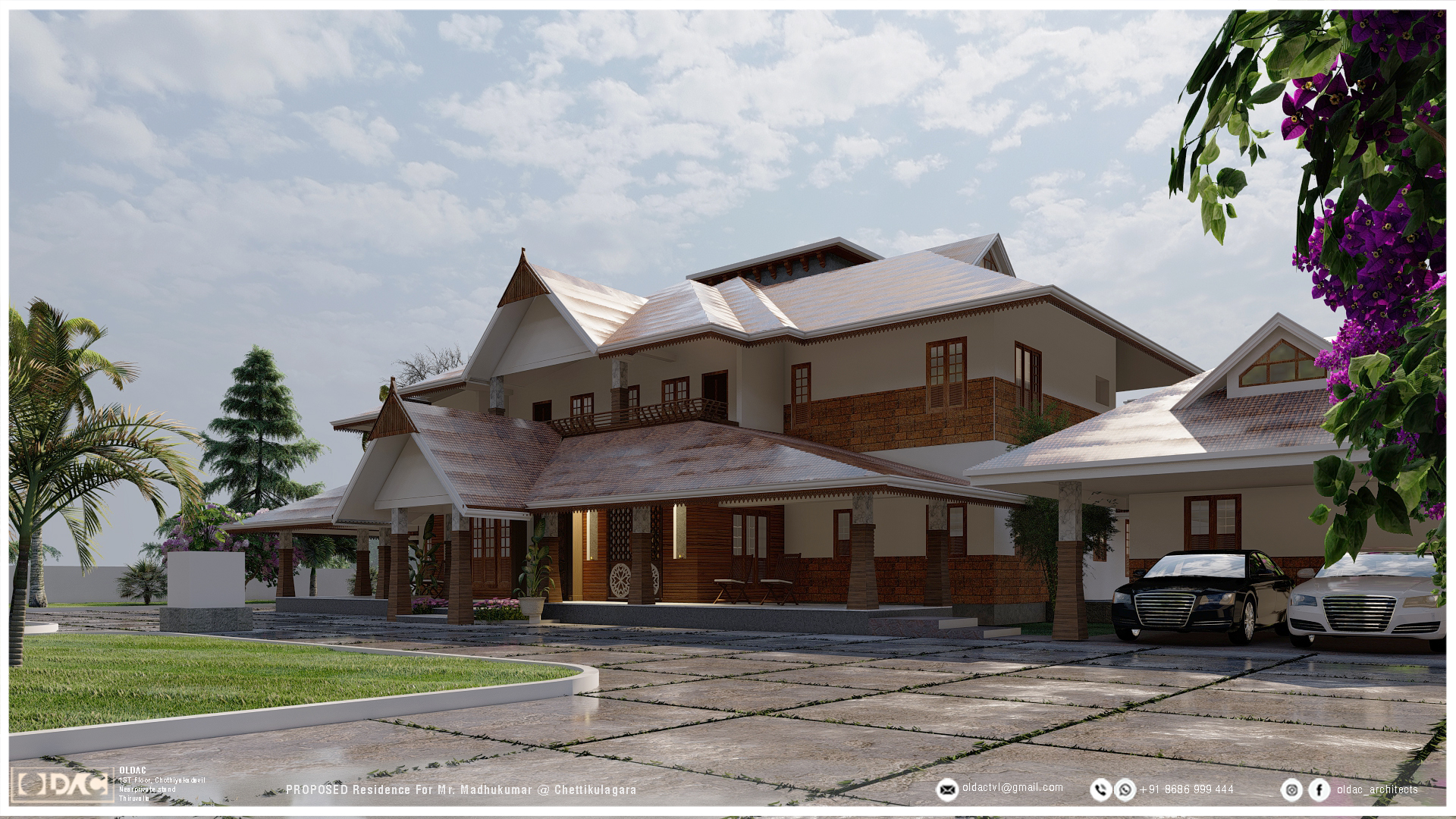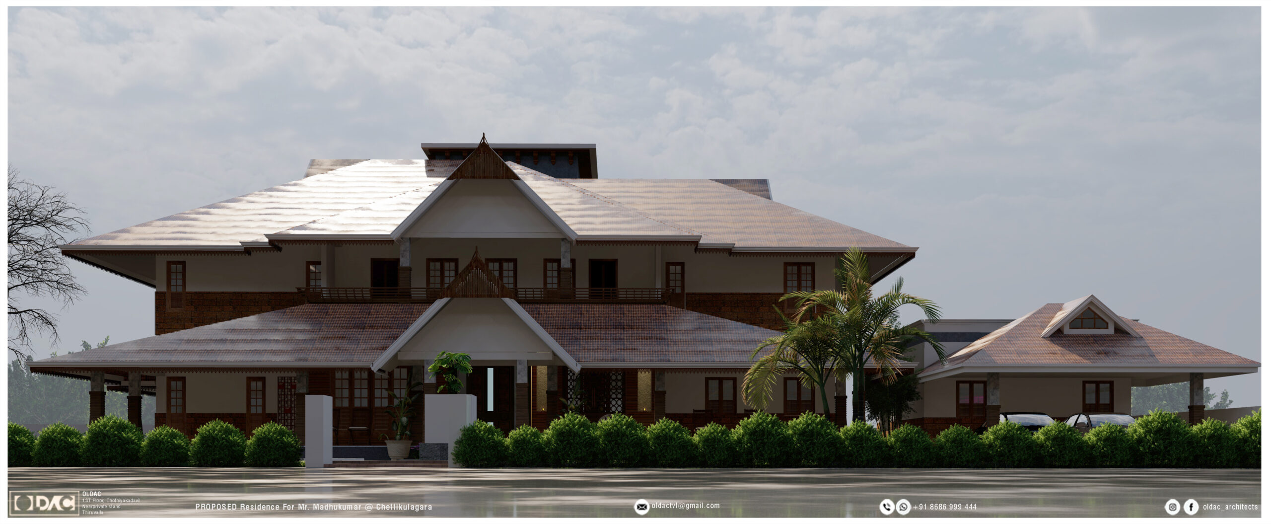 Set in the heart of Chettikulangara, this 7000 sqft mansion is a refined blend of Kerala’s timeless traditional architecture and modern structural design. Guided by the vision of Ar. Santhosh Varughese, the residence celebrates the warmth of heritage through carved wooden details, sloping tiled roofs, and natural ventilation while integrating functional modern elements like open courtyards, layered lighting, and seamless indoor–outdoor transitions.